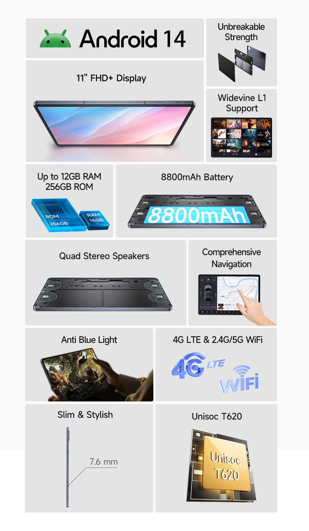 يوليفون تابلت تاب A11 مقاس 11 بوصة | وذاكرة رام 6 جيجابايت وذاكرة داخلية 256 جيجابايت لون رمادي